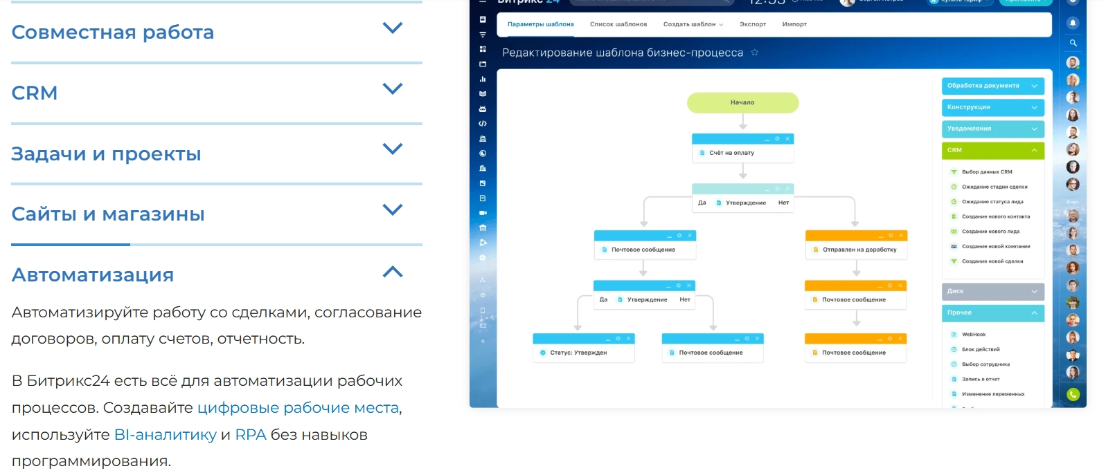 Автоматизируйте повторяющиеся процессы: создание задач, уведомления, маршруты согласования и бизнес-процессы. Используйте роботов и триггеры, чтобы ускорить работу и минимизировать ошибки.