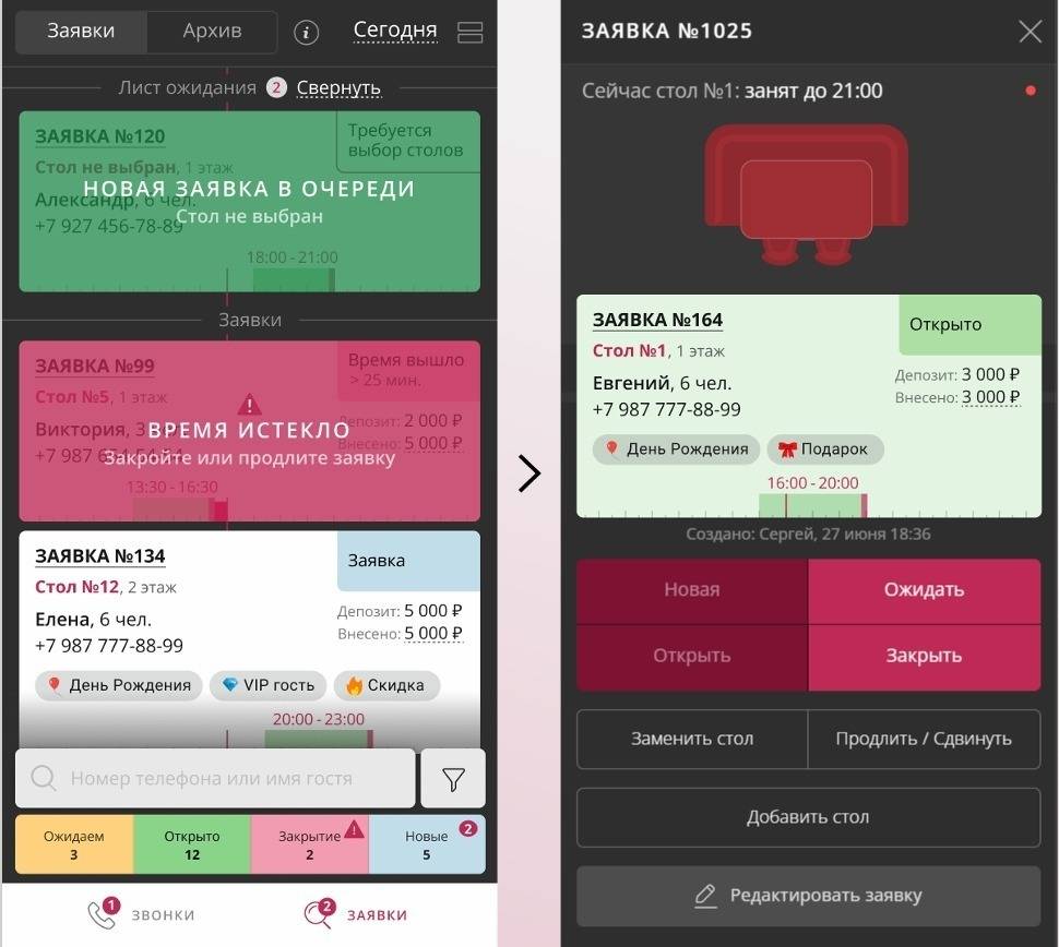 Полностью заменяет бумажные журналы: хостес и администраторы видят все брони в одном интерфейсе, могут быстро подтверждать, переносить и назначать столы, избегая ошибок и накладок.