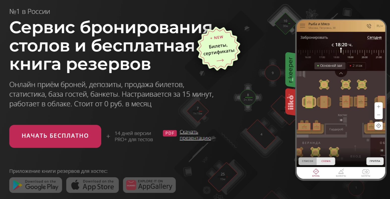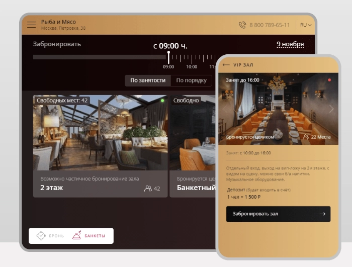 Restoplace поддерживает полноценный учёт и управление банкетами: резервирование залов, фиксация условий, времени, количества гостей, депозитов и специальных требований. Удобно как для менеджеров, так и для гостей.
