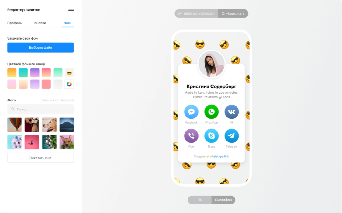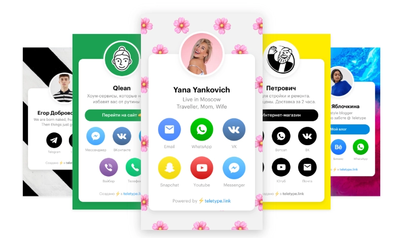 Визитка позволяет не только показать все контакты, но и направлять сообщения клиентов в единый центр общения. Благодаря интеграции с Teletype вы можете принимать обращения из разных мессенджеров в одном интерфейсе — удобно, быстро и без переключений между приложениями.