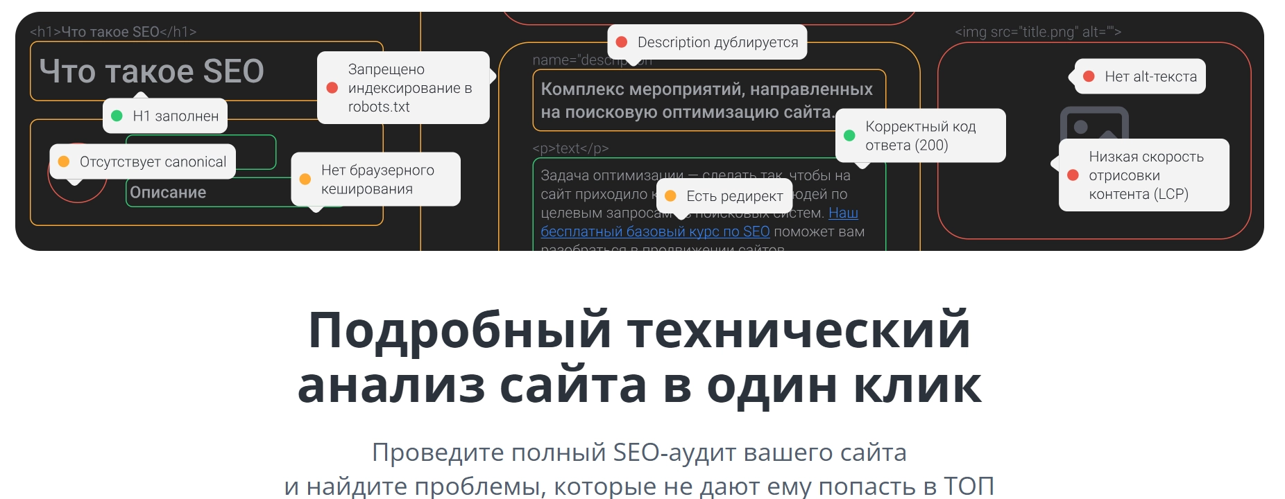 Инструмент анализирует сайт по ключевым техническим и SEO-параметрам, находит ошибки, влияющие на видимость, и формирует отчёт с приоритетами исправлений, что помогает быстрее выйти в ТОП.