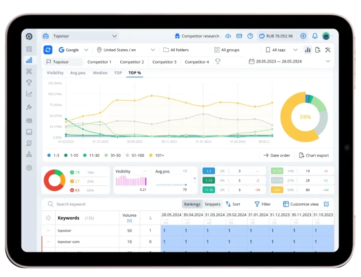 Топвизор позволяет мониторить позиции сайта с максимальной точностью, учитывая регион, тип устройства и персонализацию выдачи. Вы можете сравнивать свои результаты с конкурентами и оперативно реагировать на любые изменения.