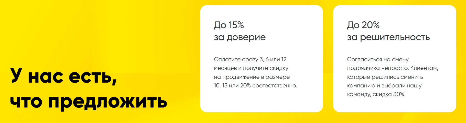 Если Вы приняли решение сменить подрядчика и выбрали Умный Сервис, команда предоставляет дополнительную скидку до 30%, отмечая Вашу смелость и стремление к качественному SEO-продвижению.