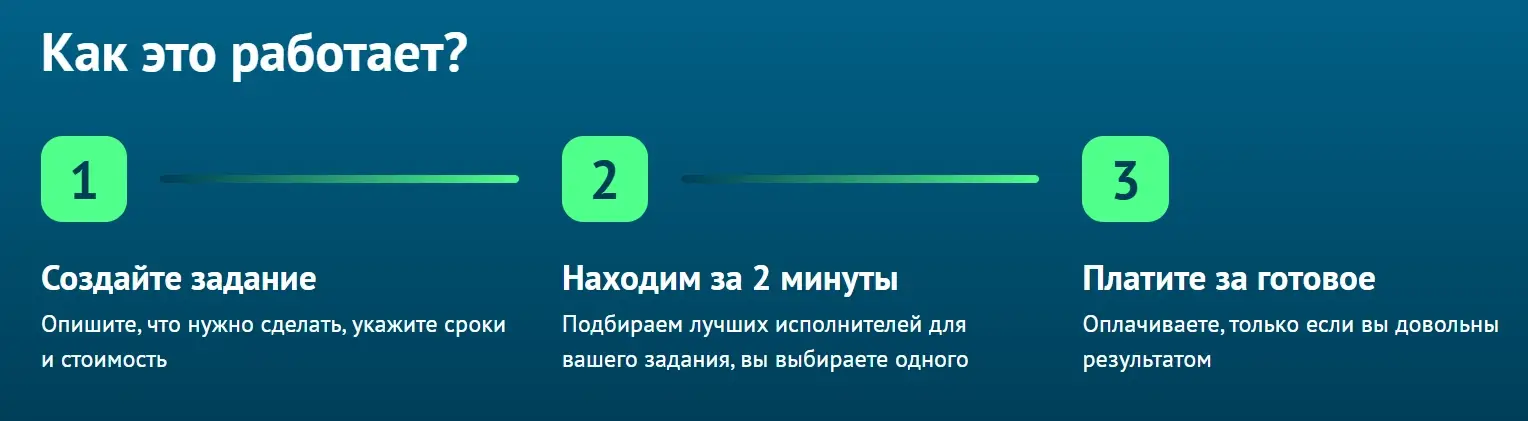 Всё происходит в одном окне: размещаете задание с чётким ТЗ, получаете отклики, обсуждаете детали в встроенном чате, выбираете исполнителя и оплачиваете через систему.