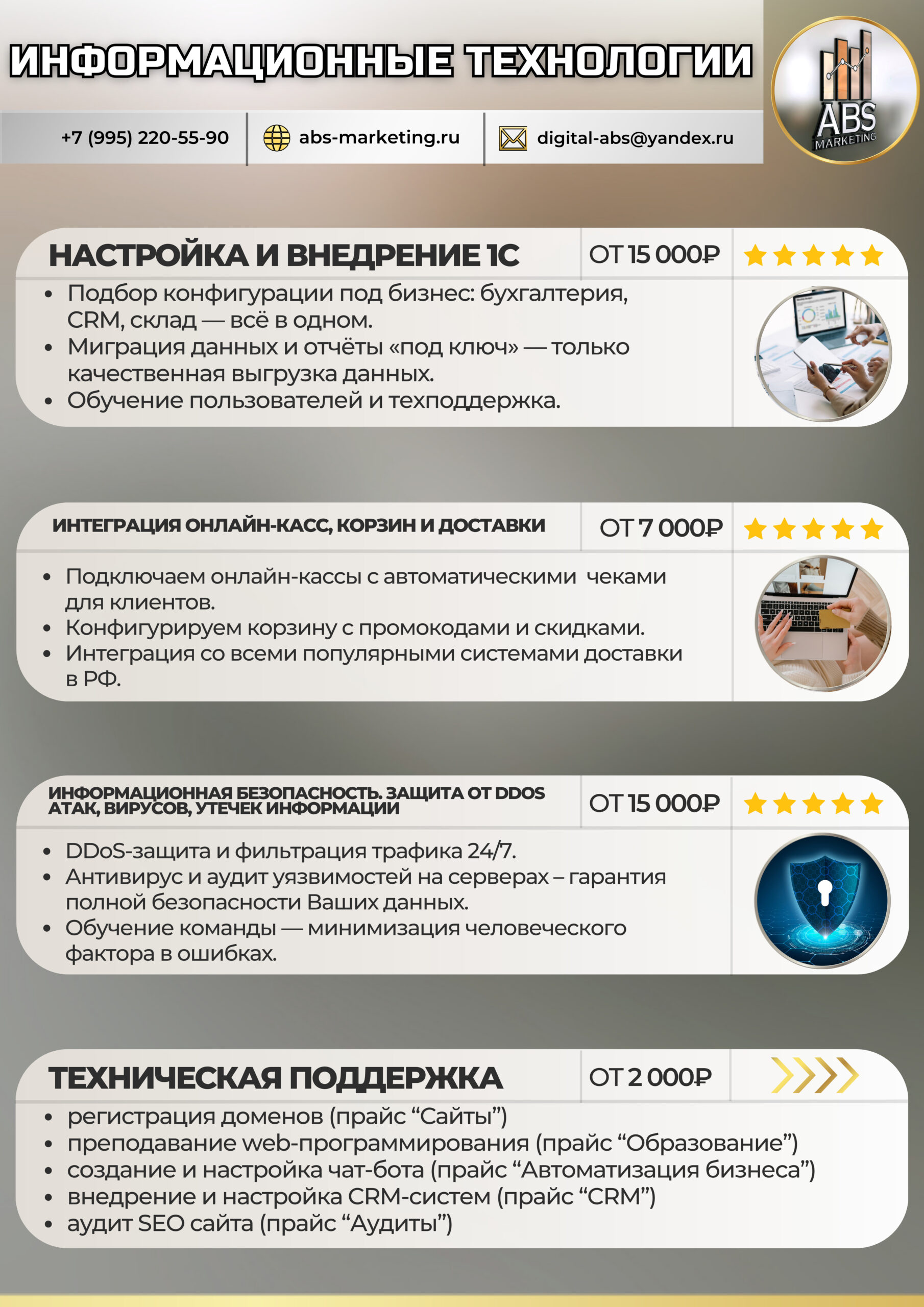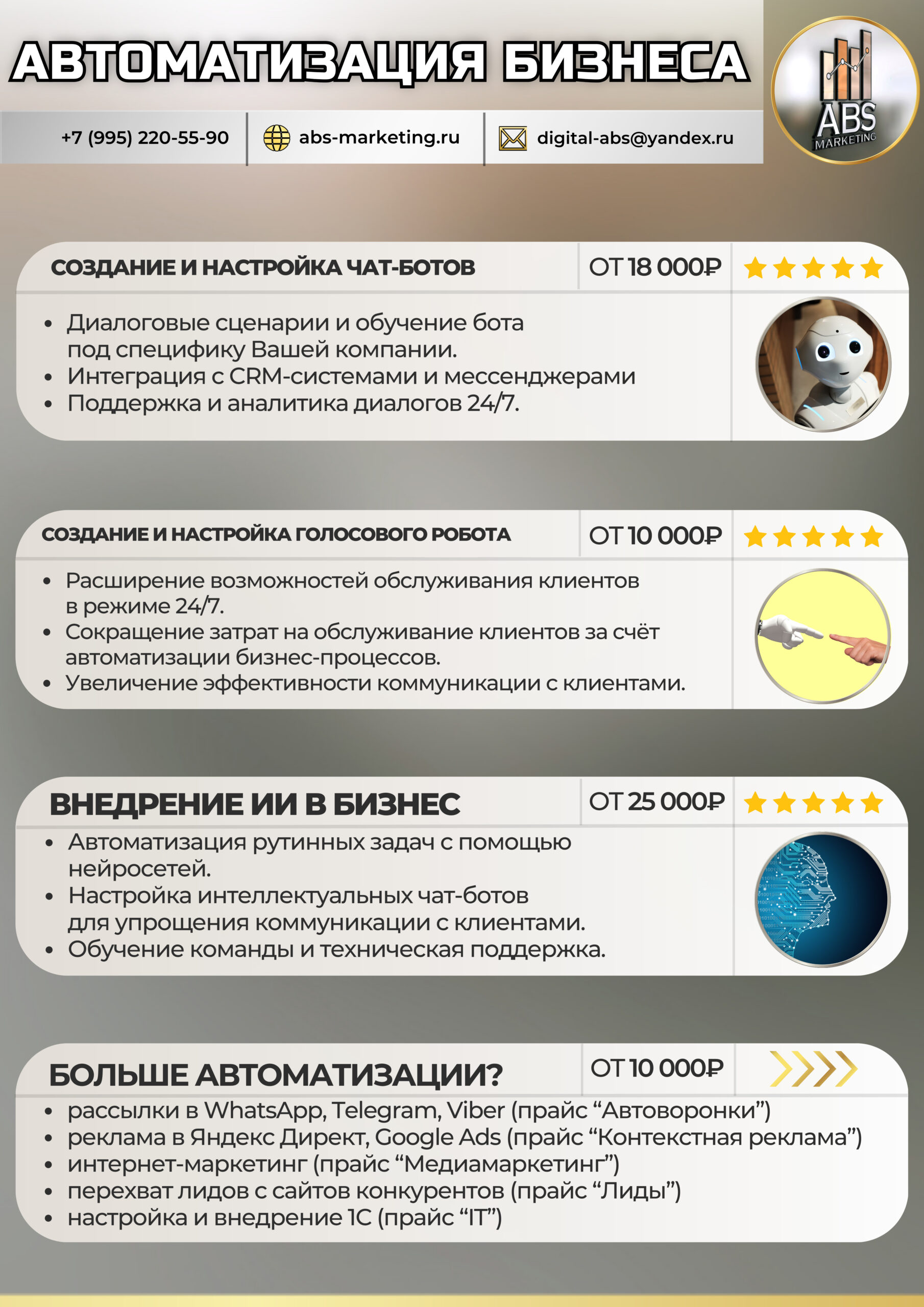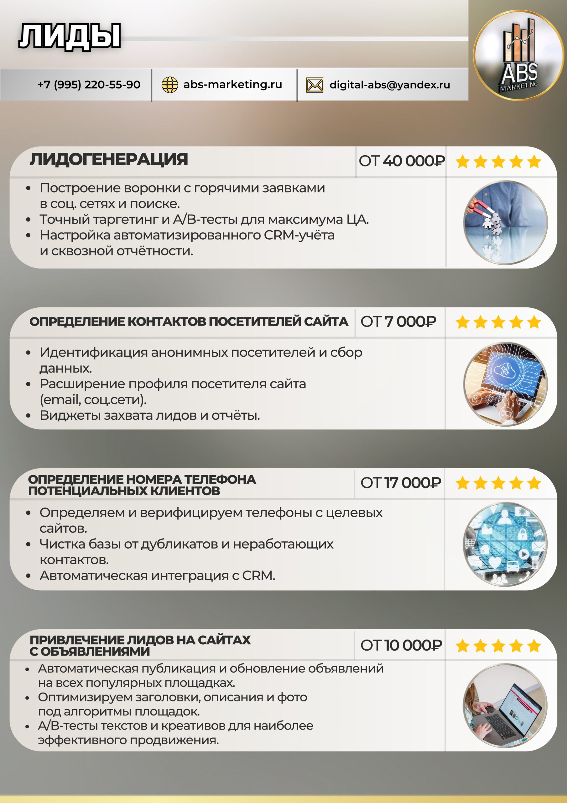 Прайсы ABS-Marketing помогут Вам сориентироваться в стоимости и масштабе предлагаемых решений. Итоговая сумма всегда рассчитывается под бизнес — с учётом Ваших задач, целей и специфики. Мы не предлагаем «универсальные пакеты», потому что уверены: у бизнеса нет типовых сценариев.